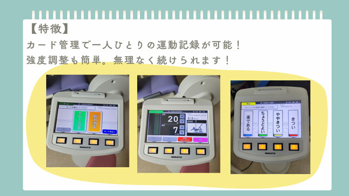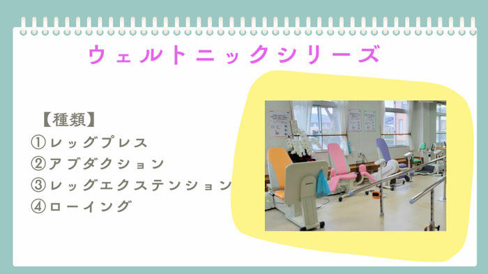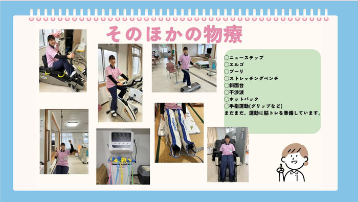 (九州初となるスプリントに加え、長崎県初の導入となったボディスパイダー、クロストレーナー、チェストリンク、ニューステップ、エルゴ、乗馬、パワーリハがあります)